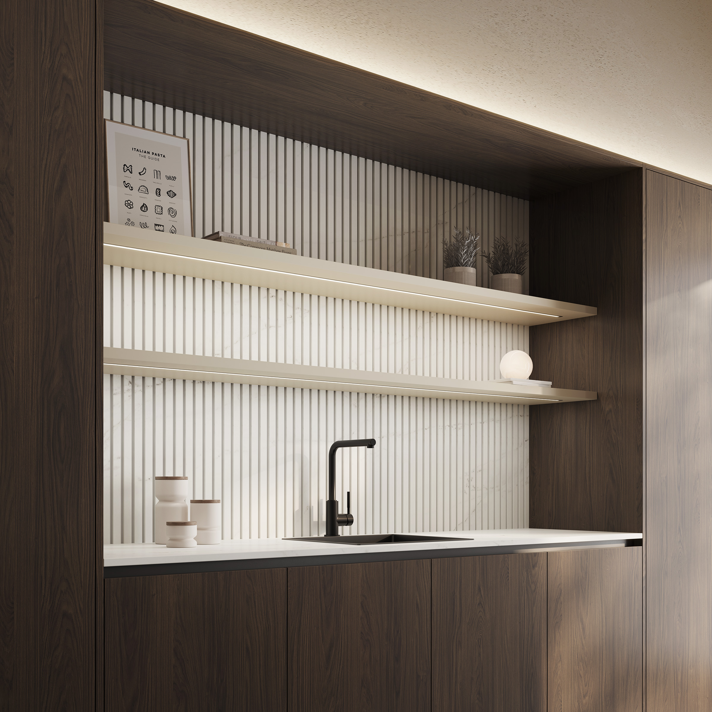 A distribuição em L, complementada por uma ilha central, otimiza o espaço e fomenta a interação entre quem o habita. Cada elemento foi cuidadosamente concebido para alcançar um equilíbrio entre funcionalidade e conforto, permitindo que as tarefas diárias fluam de forma natural e eficiente. O design limpo e os acabamentos suaves reforçam a sensação de ordem e serenidade.