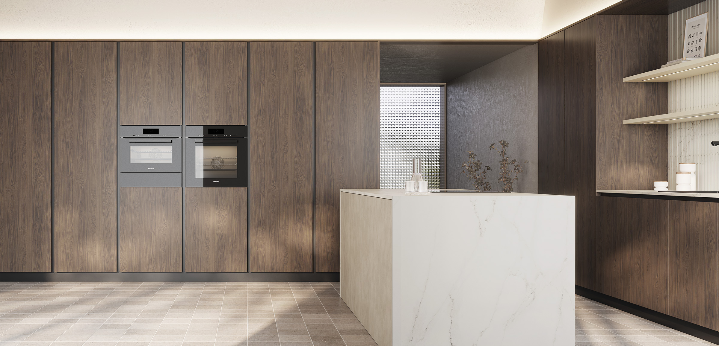 Esta cozinha apresenta um acabamento laminado com abertura gola, que proporciona uma estética elegante, sem perder o calor que transmite à primeira vista. A textura e a tonalidade da madeira dominam cada superfície, envolvendo o ambiente numa atmosfera acolhedora.