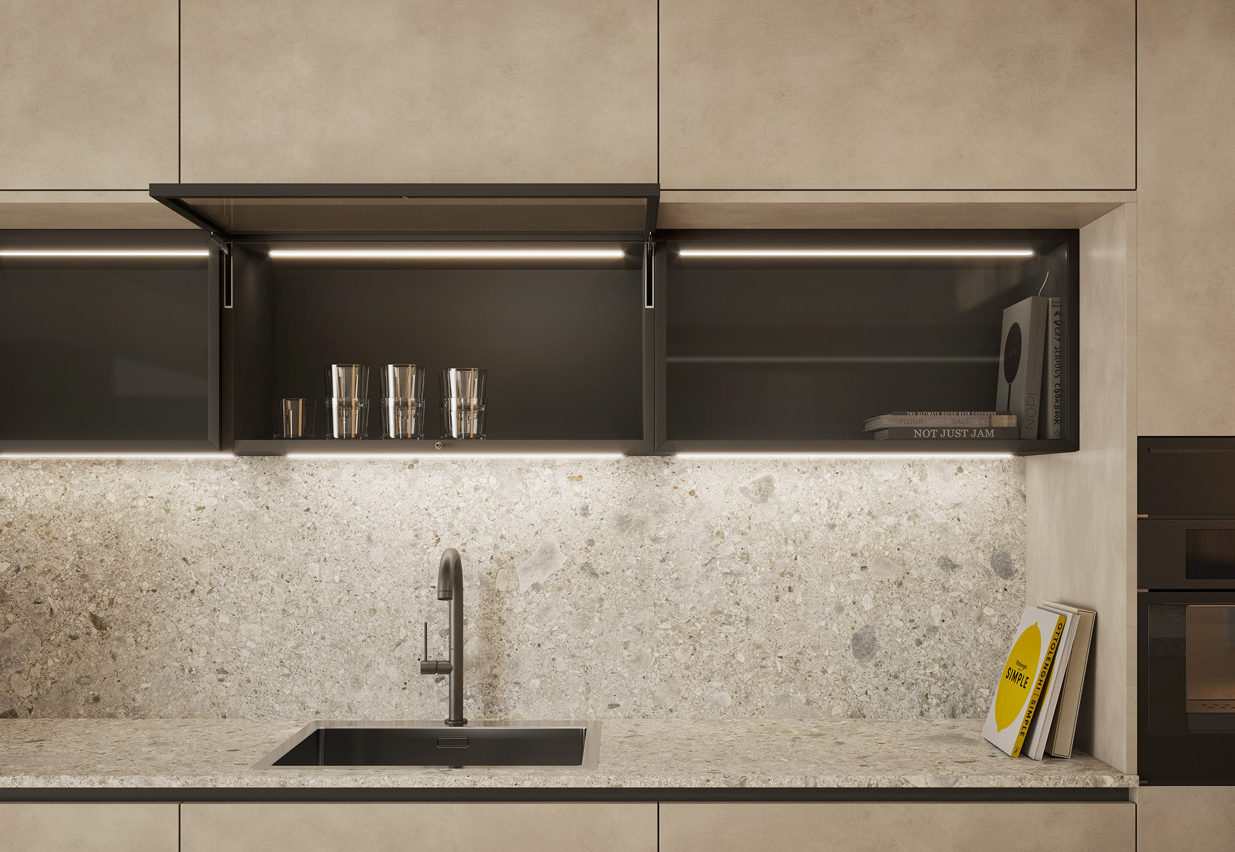 Nesta cozinha com acabamento laminado e abertura gola, o efeito pedra assume o destaque, trazendo textura e um caráter naturalmente sofisticado ao espaço.