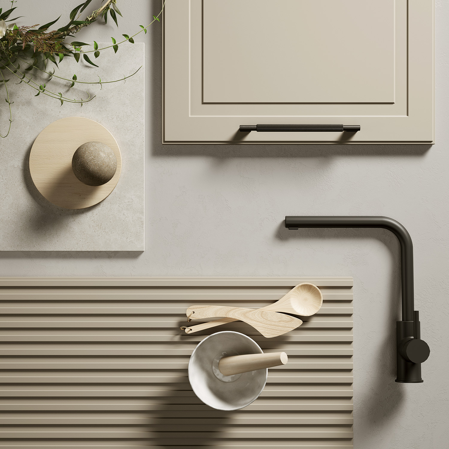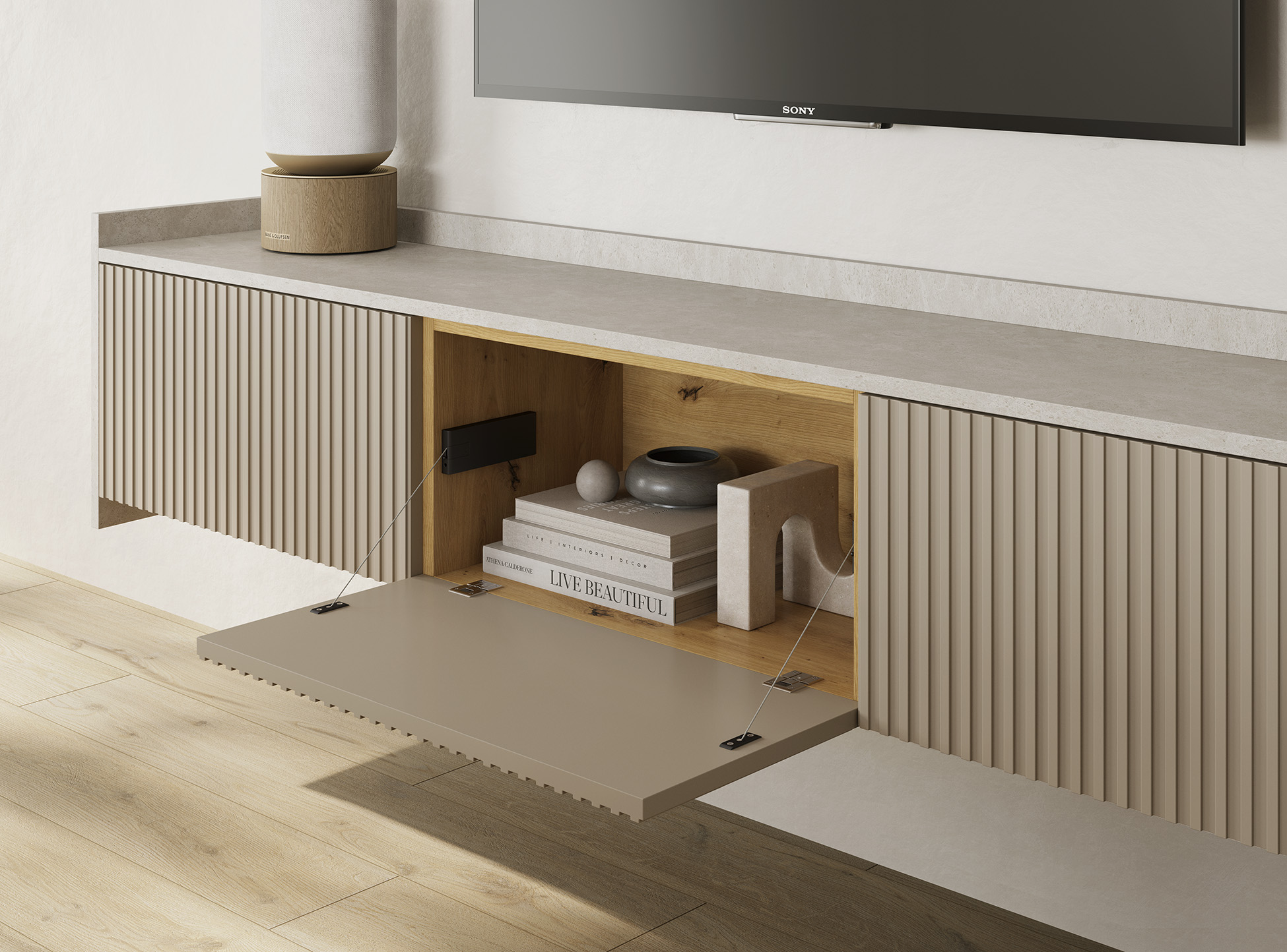 As tonalidades suaves e o design equilibrado garantem ordem e leveza visual. O módulo com sistema Link assegura uma transição fluida para a zona de dia, criando continuidade no espaço.