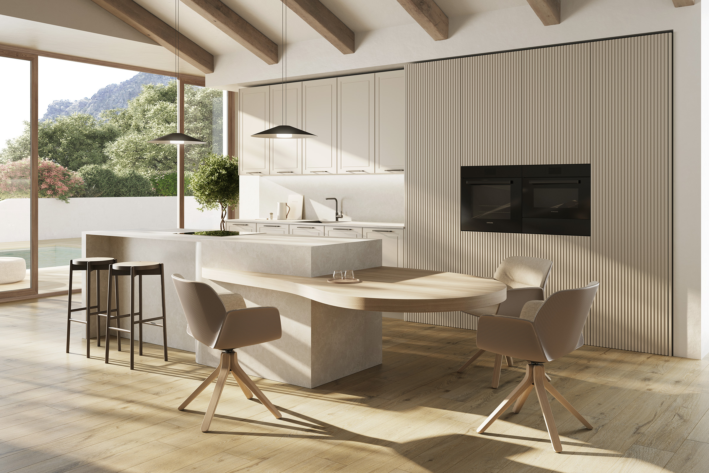Esta cozinha com acabamento lacado e puxador combina elegância e simplicidade. A luz natural realça as superfícies suaves e cria um ambiente claro, acolhedor e harmonioso.